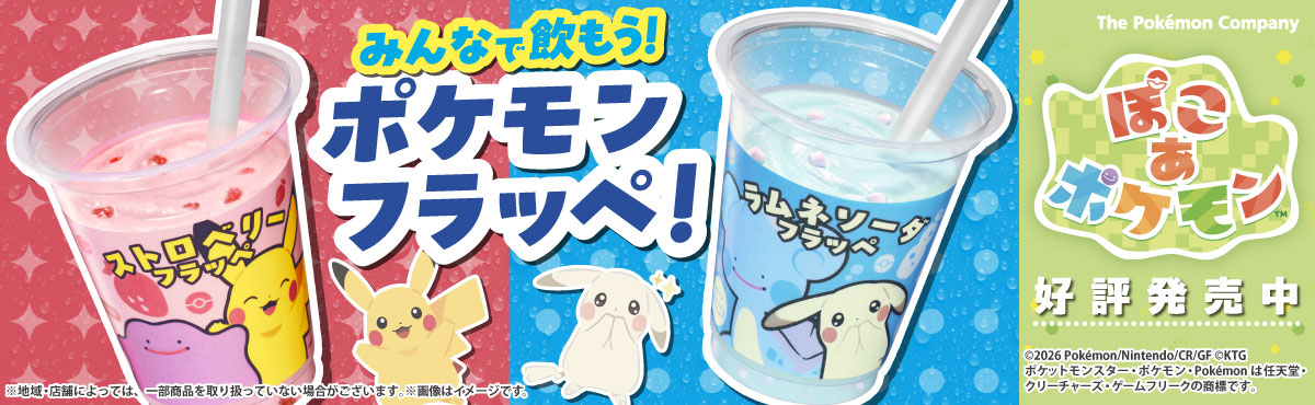 みんなで飲もう!ポケモンフラッペ! 『ぽこ あ ポケモン』デザインのフラッペを4月28日(火)発売 ちゅるんとゼリーのストロベリー味としゅわっとラムネソーダ味が登場 メタモンとピカチュウのオリジナル商品も展開