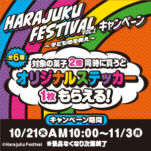 対象の菓子2個同時に買うとオリジナルステッカー1枚もらえる!さらに、チャームやクリアファイル発売!