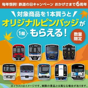 対象のペットボトル飲料を買うと、鉄道会社9社の人気鉄道車両をデザインした「オリジナルピンバッジ」がもらえる!