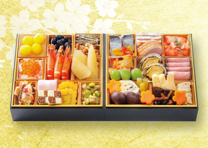 伝統的な和の味わいと彩り豊かな和洋折衷の品々をお楽しみいただける二段重です。豪華なローストビーフや味わい深い蝦夷あわびの旨煮など、和と洋の贅沢な味わいが詰まっています。
