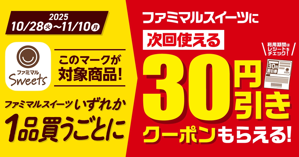 期間中に「ファミマルSweets」のマークがついた手づくりデザート・焼き菓子を購入いただくと、「ファミマルSweets」いずれか1品に次回使用できる30円引きレシートクーポンがもらえます。