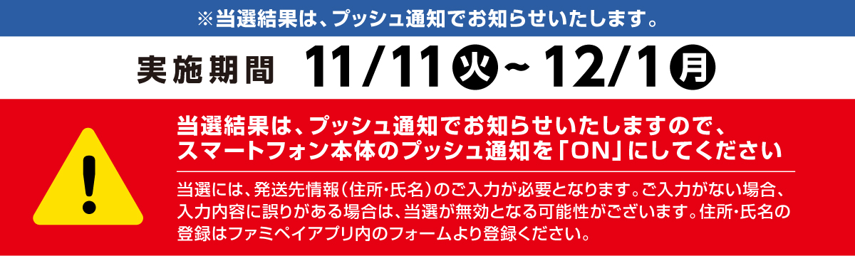 - 当選はプッシュ通知でお知らせいたします。(お持ちのスマートフォンのプッシュ通知設定を、ONにする必要があります。)