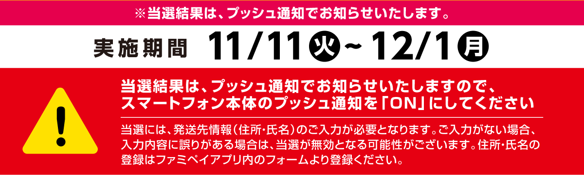 - 当選はプッシュ通知でお知らせいたします。(お持ちのスマートフォンのプッシュ通知設定を、ONにする必要があります。)