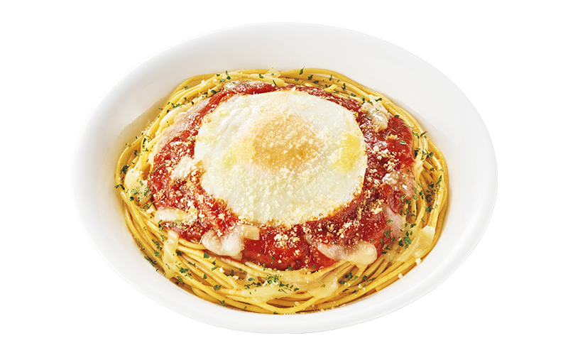 4種類のトマト原料、バジル、味噌を使用したトマトのソースで、風味とコクにこだわった深い味わいのパスタです。4種類のチーズや目玉焼きをトッピングしています。※一部地域は仕様が異なります。