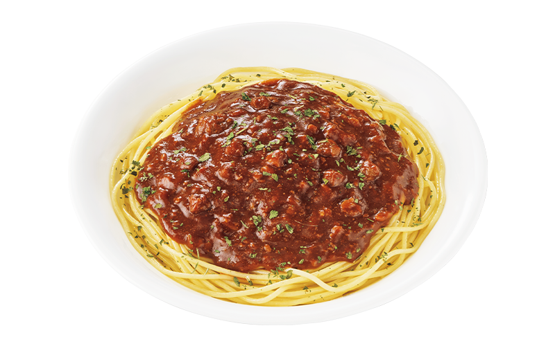 トマトの風味とデミグラスソースのコク深い味わいが特長のミートソースのパスタです。肉の旨味もしっかり効いており、ファミリーマートで人気のパスタです。