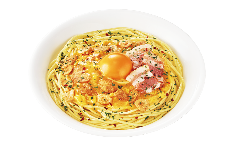 コンソメやだしの旨味がきいたペペロンチーノに、たまごのソースを絡めた、まろやかさの中にもパンチがある仕立てのパスタです。