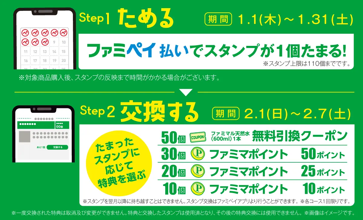 ファミリーマート店舗でファミマのアプリを提示して、ファミペイ払い(1円以上※1)すると(対象外商品を除く)お買い物ごとにスタンプが1個(最大110個※2)たまります。2026年2月1日(日)以降、4つの特典の各コースお一人様1回限り、ためたスタンプを使用して交換いただけます。