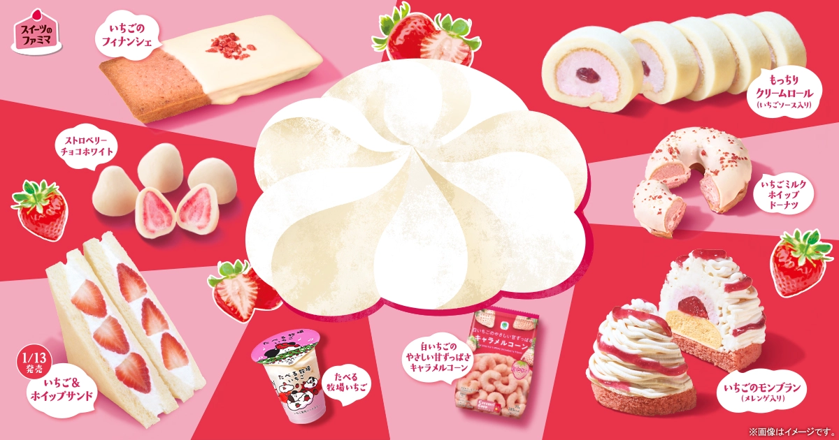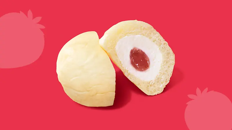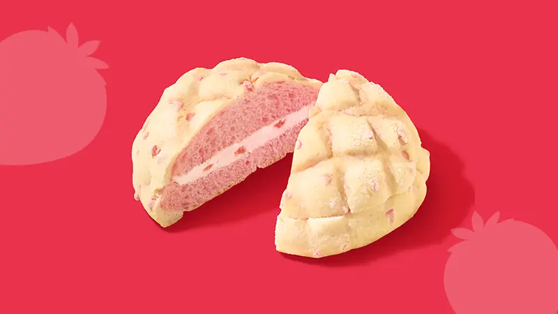 いちご風味チョコチップを練り込んだ白いビスケット生地をかぶせたメロンパンに、いちご果肉入りミルクホイップをサンドしました。