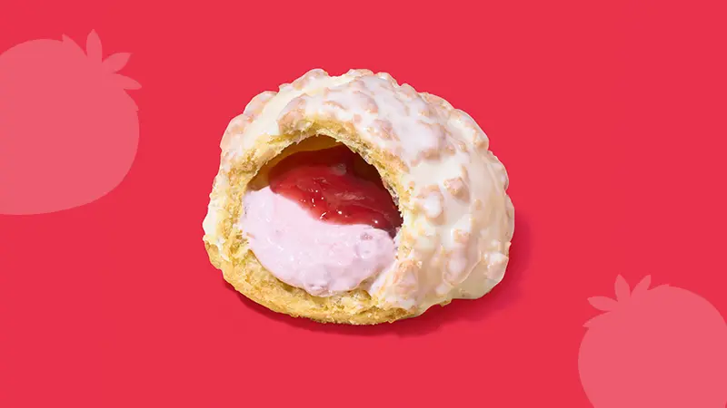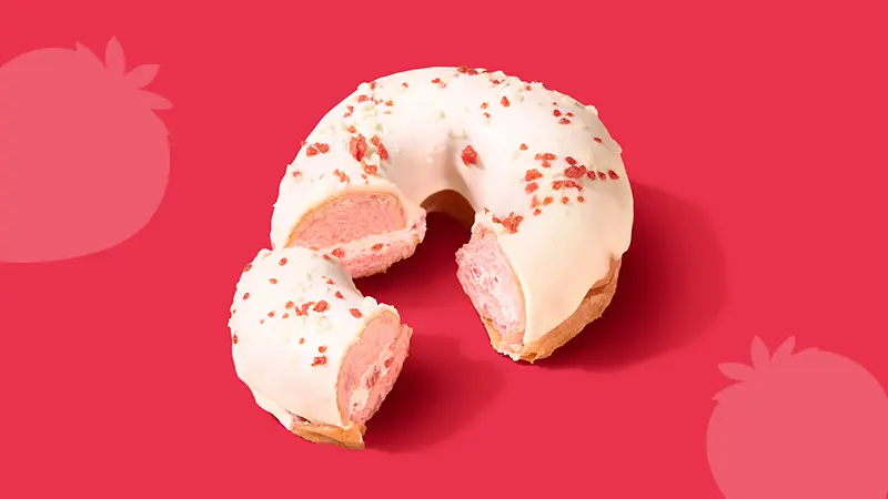 ピンク色のドーナツ生地にいちご果肉入りミルクホイップをサンドし、上からホワイトチョココーティングと2種類のクランチをトッピングしました。