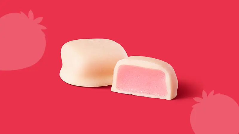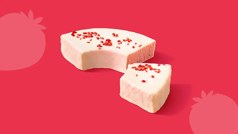 マシュマロのようなふんわり食感のいちご味のグミに、優しい甘さのホワイトチョコをコーティングしました。