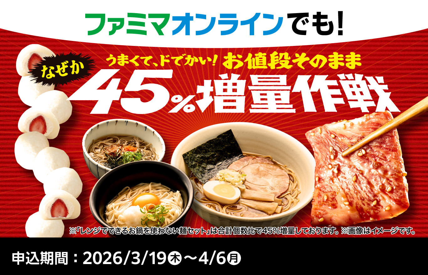 ファミチキや弁当、サンドイッチなどの人気商品を「お値段そのまま」で約40%増量して発売し、毎年大きな反響をいただいています。