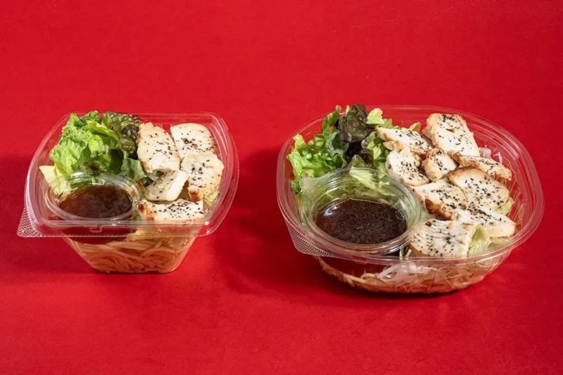 醤油などで味付けしたパスタにしっとりした食感のローストチキン、シャキシャキ野菜を合わせたパスタサラダを“なぜか45%”増量しました。たんぱく質量も25.0g(1包装あたり)と大幅アップ!醤油ベースの和風オニオンドレッシング付きです。