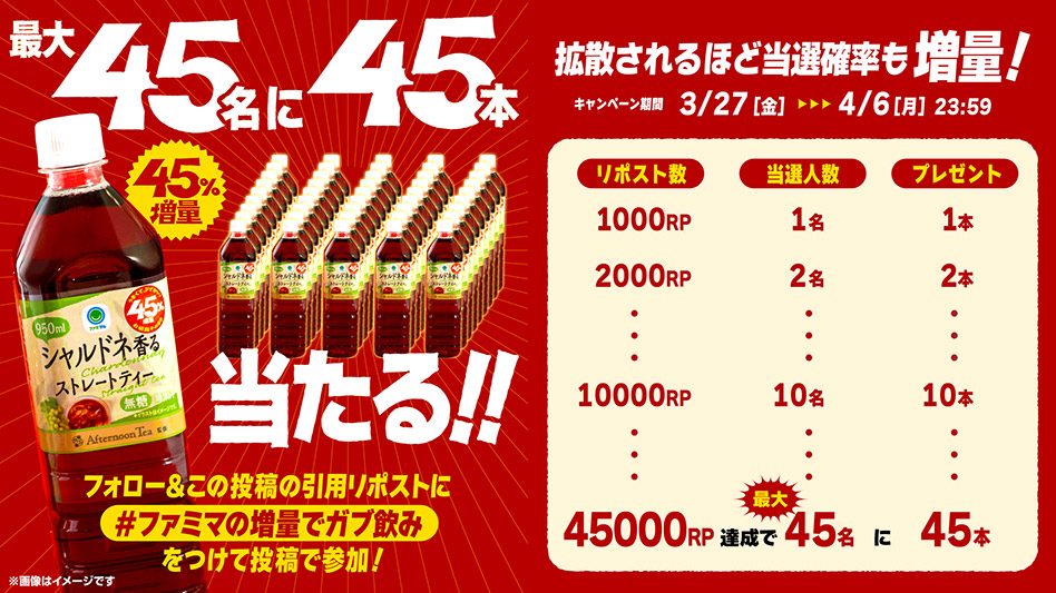 ファミリーマート公式X(@famima_now)をフォローのうえ、対象の投稿に指定のハッシュタグをつけて引用ポストしていただくと、「Afternoon Tea監修 シャルドネ香るストレートティー 950ml」が当たります。対象投稿の引用ポスト数に応じて当選人数が最大45名、プレゼント本数は45本になります。