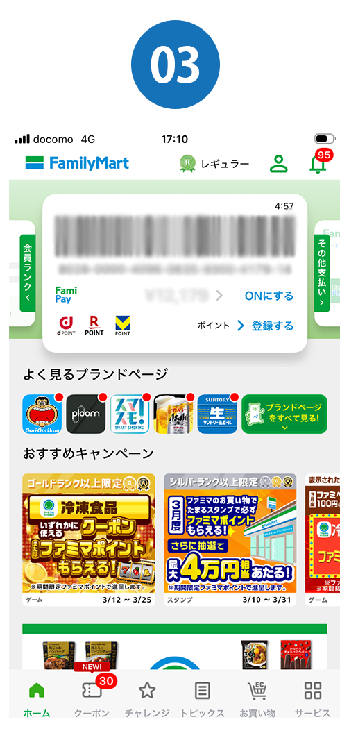 - キャンペーン期間中、ファミマのアプリのバーコードをレジでスキャンし、スタンプがたまる対象商品をご購入ごとにスタンプが1個たまります。