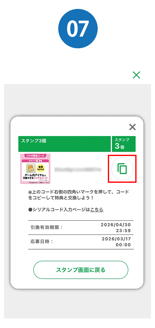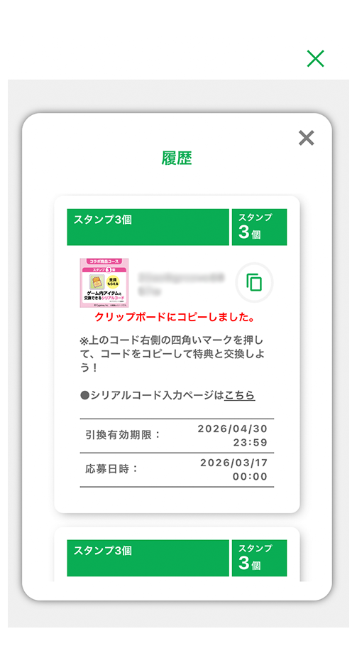 - ※本シリアルコードの有効期限は、2029年3月17日23:59までです。有効期限を過ぎたコードは無効となり、報酬は獲得できません。