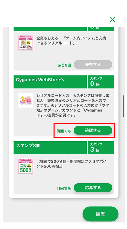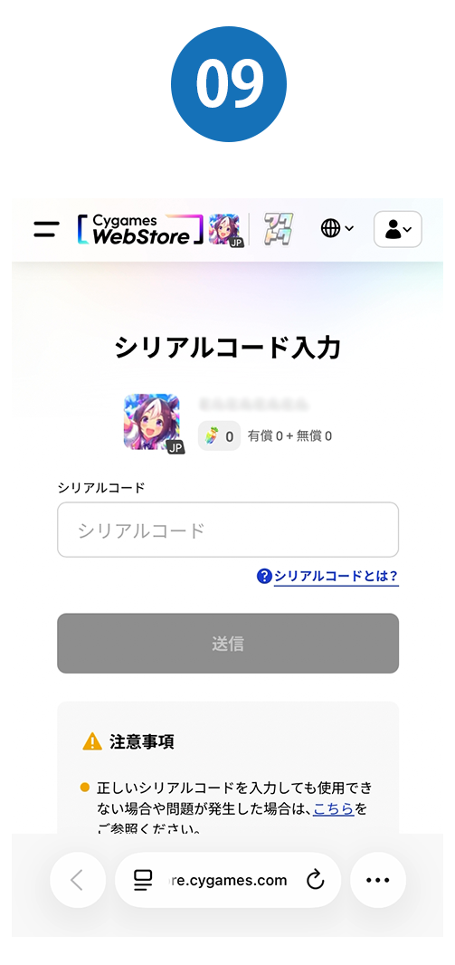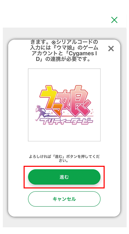 - ※シリアルコードの入力には、Cygames IDを登録(無料)しゲーム『ウマ娘 プリティーダービー』のゲームアカウントを連携していただくか、「Google Play版」、「DMM GAMES版」、「Steam版」いずれかのゲーム『ウマ娘 プリティーダービー』の登録(無料)が必要です。