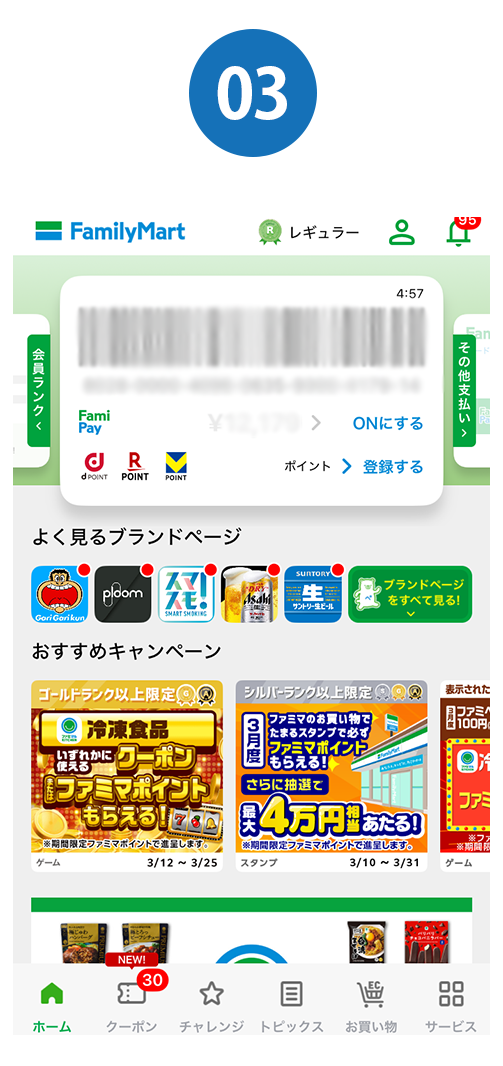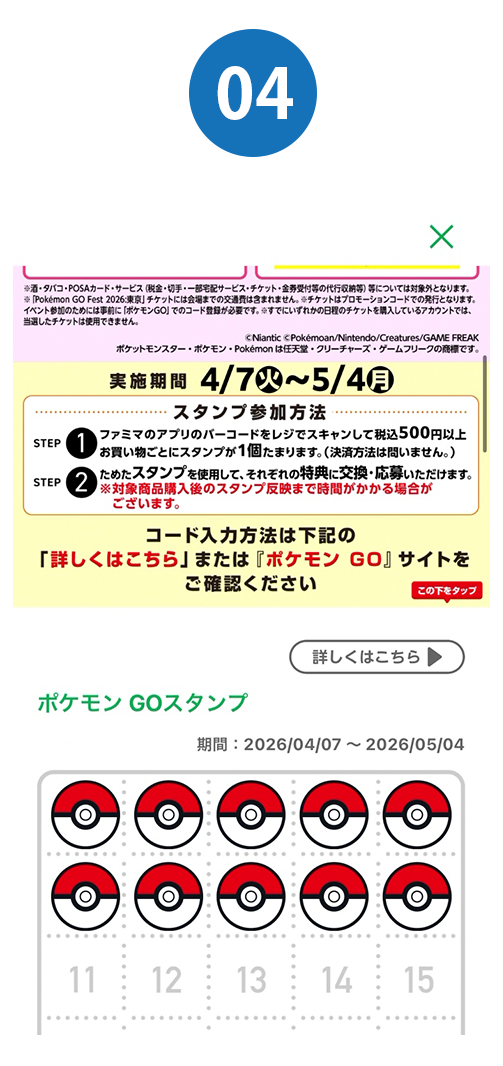 スタンプ開催期間中に、ファミリーマート店舗でファミマのアプリのバーコードをスキャンして500円(税込)以上購入する(対象外商品を除く)とスタンプが1個たまります。スタンプ交換で特典に交換・応募できます。
