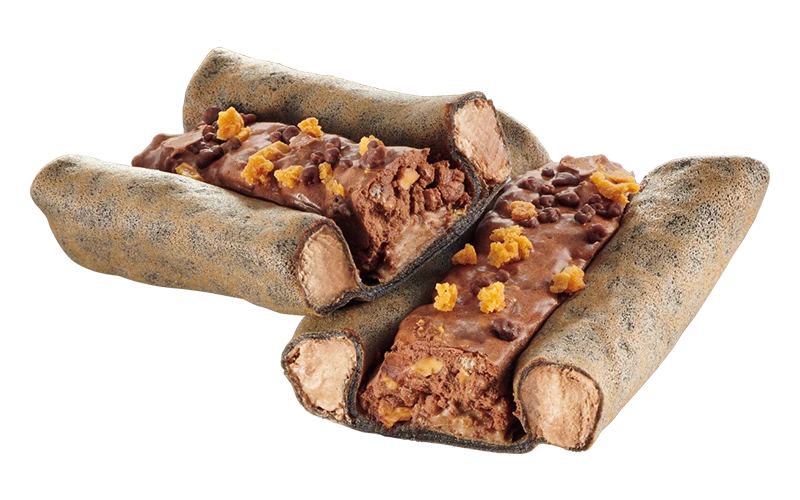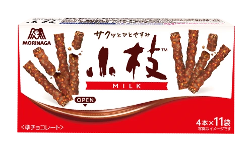 「小枝」をイメージしたクレープです。もちもち食感のクレープ生地に、チョコクリーム、クランチ、「小枝」をイメージしたチョコ掛けアーモンドパフをトッピングしました。数量限定