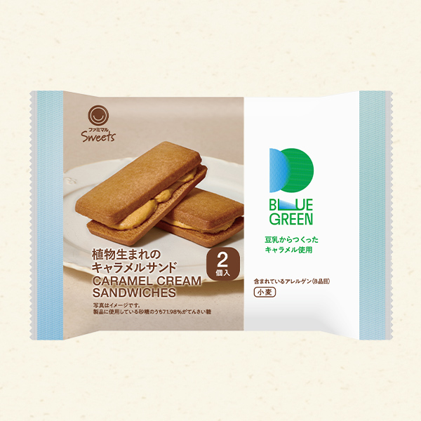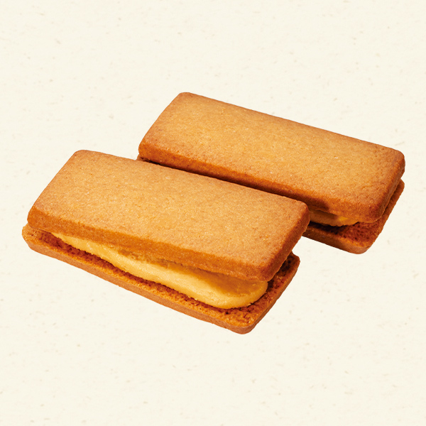 全粒粉を使ったザクザク食感のキャラメル生地に、キャラメルクリームをサンドしました。キャラメルに含まれる乳原料を豆乳やココナッツなどに置き換えています。