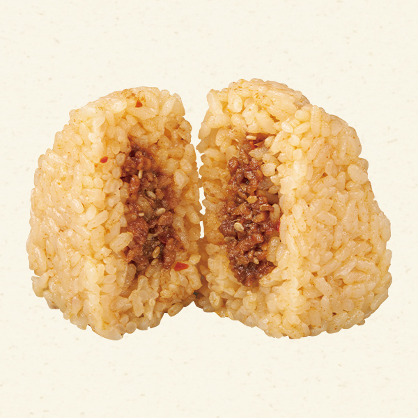 ラー油と胡麻の風味豊かなごはんに、甜面醤、豆板醤等の調味料で甘辛く味付けした大豆ミートをトッピングしたおむすびです。