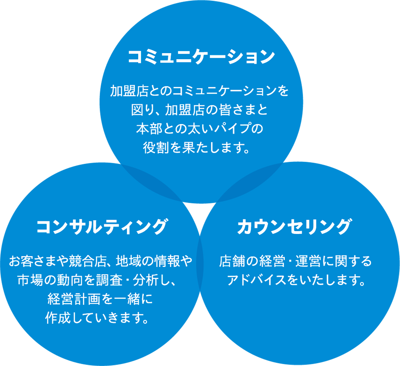 本部の戦略を加盟店に伝えると同時に、加盟店の意見、要望を本部に伝え、目標を共有し、実行します。
