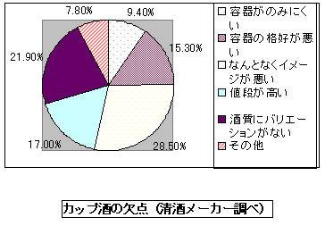 昨年秋から清酒のカップ酒がブームとなり、消費量が落ち込む清酒の起爆剤として期待されているものの、「なんとなくイメージが悪い」「酒質にバリエーションがない」「容器がのみにくい」等のデメリットの意見も多数あります(清酒メーカー調べ)。