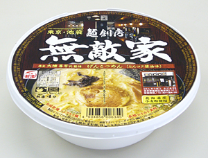 今回池袋の行列店「麺創房 無敵家」店主監修のもと、味を忠実に再現し、ファミリーマート限定で発売いたします。「麺創房 無敵家」はラーメン激戦区「池袋」でも有数の行列店で数多くの情報誌・番組などで紹介されています。トンコツをベースにコクのある醤油で上品なスッキリ感のあるスープは最後の一滴まで飲み干せて、何度食べても飽きが来ないほどの美味しさが人気の秘訣です。そのスープをベースに、麺は実物同様に北海道産小麦粉を100%使用し、チャーシュー・海苔・わけぎを添えた、こだわりの逸品です。