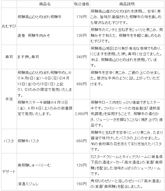 今回、ファミリーマートでは、4月14日(土)、15日(日)に行なわれる日本三大美祭のひとつである「高山祭り」を中心に、東海地区で春に最も観光客で賑わいを見せる「飛騨高山地区」に着目し、『飛騨高山フェア』として全8アイテムの商品を展開してまいります。これらの商品は身近に飛騨高山の雰囲気を楽しんでいただくために、地産地消の考えの下、いずれも地元の食材・名物を使用した商品となっています。