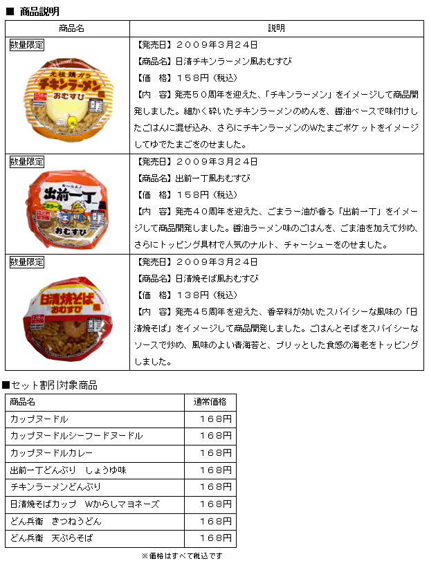 株式会社ファミリーマート(本社:東京都豊島区/代表取締役社長:上田準二)は、日清食品株式会社(本社:東京都新宿区/大阪府淀川市/代表取締役社長中川晋)が販売している人気のインスタントラーメンをイメージしたおむすび3種類を、2009年3月24日(火)から4月20日(月)の期間限定で、全国のファミリーマート約7,400店舗にて発売いたします。日清食品がコンビ二エンスストアとおむすびでコラボレーションすることは初めての試みです。
