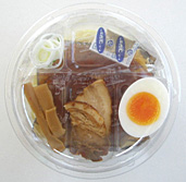 商品内容:コシのある中華麺に、ごま油を利かせた醤油味の冷たいラーメンスープと、焼豚・メンマ・半熟のゆで玉子・葱をトッピングし、味のアクセントとしてコショーを添付しました。