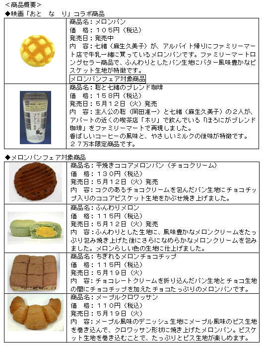 また、七緒(麻生久美子)の大好きなメロンパンをはじめ、合計6種類のメロンパンを集めた「メロンパンフェア」をあわせて開催いたします。メロンパンは、ファミリーマートのオリジナル商品である「こだわりパン工房」の中でも人気で、パンの売上が伸びるこの時期に、バラエティ豊かなメロンパンを一同に展開し、たくさんのお客さまにメロンパンのおいしさを味わっていただきたいと考えております。