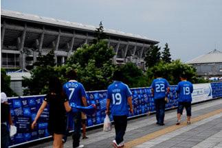今回、第2弾として、2010 FIFA ワールドカップ アジア最終予選 日本代表VSカタール代表戦が行われた横浜国際総合競技場に続く道に、サポーターから応募いただいたメッセージをブルーの横断幕に仕上げ掲出いたしました。