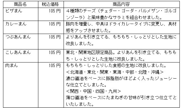 まずは、「ピザまん」「カレーまん」「つぶあんまん」を、8月11日(火)から東北・中国・四国・九州を皮切りに開始し、「肉まん」は、9月1日(火)から、東北・北陸にて、順次導入していまいります。