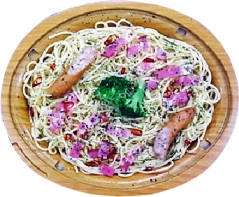 【特 徴】デュラムセモリナ100%の小麦粉で作ったパスタを、アルデンテに仕上げ、にんにく、唐辛子を炒めたオリーブ油で絡めた、シンプルなペペロンチーノです。ベーコン、ウインナー、ブロッコリーをトッピングしました。
