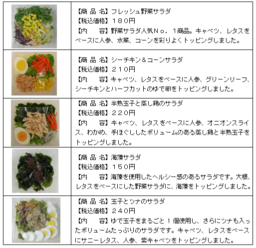 「半熟玉子と蒸し鶏のサラダ」など売れ筋の野菜サラダ5種類に人気の高いレタスを追加し、ボリュームをアップさせるとともに、環境負荷のより少ないバイオマスプラスチック容器にて展開してまいります。これにより、いつものコンビニエンスストアでのお買い物で身近にエコを感じていただけると考えております。