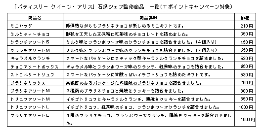 ファミリーマートでは、「パティスリー クイーン・アリス」石鍋シェフに監修いただいた、洋菓子の詰め合わせを12種類発売いたします。今年初めての取組として、砕いた薄く焼いたクレープ生地を加えサクサクとした食感がアクセントのチョコレート“フィヤンティーヌ”や、女性に人気の“フランボワーズ風味のクランチチョコレート”を、詰め合わせのバリエーションに追加しました。(※別紙参照)