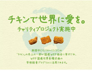 お客さまのチキン商品購入数に応じて寄付額が増える仕組みですので、クリスマスから年末にかけて最もチキン商品の需要が高まるこの時期に実施することで、より多くのお客さまに世界の食糧事情について関心を持っていただき、ご参加いただきたいと考えております。