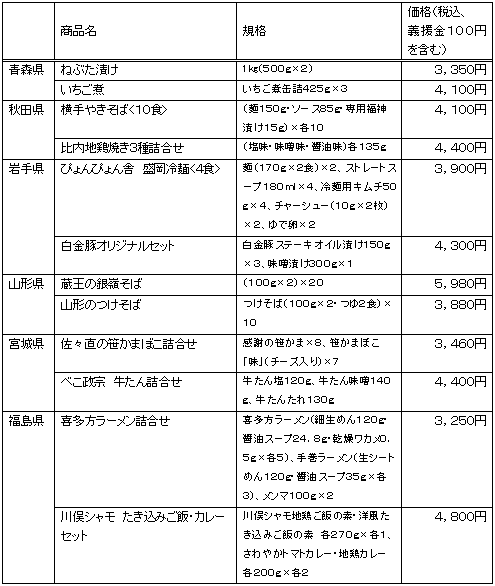 このたびは、「東北6県のご当地“うまいもの”を食べて応援しよう!」とのテーマのもと、岩手県の“ぴょんぴょん舎 盛岡冷麺(4食)”(税込3,900円)や、宮城県の“佐々直の笹かまぼこ詰め合わせ”(税込3,460円)や、福島県の“川俣シャモたき込みご飯・カレーセット”(税込4,800円)など、東北地方6県のご当地グルメ合計12種類を集めた東北応援ギフトを展開いたします。(商品詳細は下記参照)