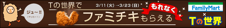 カルチュア・コンビニエンス・クラブ株式会社(以下「CCC」)と株式会社ファミリーマート(以下「ファミリーマート」)は、2014 年 3 月 11 日より、ファミリーマートと T カード連動型街づくりゲーム『T の世界』とのコラボレーション企画として、期間中にファミリーマートへ来店されると、来店日数に応じて、ゲーム内で使用できるアイテムや、ファミリーマートで人気の「ファミチキ」の商品引換券がもらえる「ファミリーマートに行ってファミチキ GET!」キャンペーンを実施いたします。