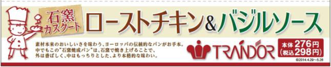 株式会社ファミリーマート(本社:東京都豊島区/代表取締役社長:中山勇)は、株式会社トランドール(本社:福岡県福岡市/代表取締役社長:山田眞弘)がJR九州の主要駅を中心に展開する人気ベーカリー「TRAINDOR」とコラボレーションした調理パン「石窯カスクート(ローストチキン&バジルソース)」(本体:276円、税込:298円)を、2014年4月29日(火)から九州地方(福岡県・佐賀県・長崎県・熊本県・大分県・山口県の一部)のファミリーマート店舗約900店で発売いたします。