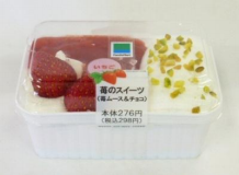 【内容】ふんわり食感で甘酸っぱい苺ムースの上に、食感のアクセントとしてチョコレートを重ね、ホイップクリームを絞り、苺の果肉とソースを飾ったスイーツです。