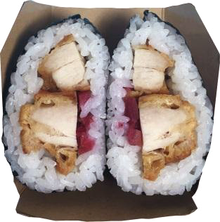 【内容】人気のおかず鶏唐揚げと、紀州産のカリカリ梅を合わせた、サンドおむすびです。唐揚げの下味に梅酢を使用することで、唐揚げにも梅の風味を加えました。