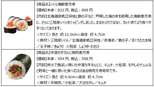 2018年1月16日(火)午前9時までのご予約限定で、2本まとめてお買い求めいただくことで1本ずつ買うより60円お得になっている「恵方巻(2本入)」(本体:667円、税込:720円)と「海鮮恵方巻(2本入)」(本体:723円、税込:780円)が、50円引きと更にお得にお買い求めいただけます。