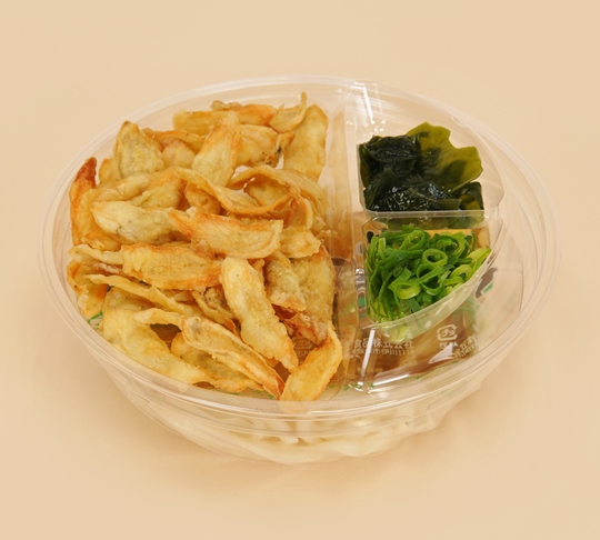 【内容】九州産小麦を使用したのどごしのよい麺。つゆは、にぼしやかつお節、焼きあごなどでだしをとりました。ごぼうの天ぷら、わかめ、ねぎをトッピングしました。