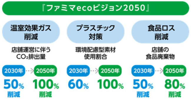 ファミリーマートでは、「ファミマecoビジョン2050」を掲げ、「温室効果ガス(CO2排出量)の削減」、「プラスチック対策」、「食品ロスの削減」の3つのテーマについて、2030年及び2050年に向けた中長期目標を設定し、持続可能な社会の実現に貢献するための取り組みを行っております。