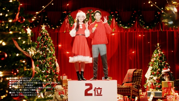このたび、放映する新TVCM「順位発表」篇には、ファミリーマート40周年アンバサダーをつとめる玉木宏さん八木莉可子さんが出演いたします。「日本で2番目に人気のチキンのお店」であることを、玉木宏さんとサンタクロース姿の八木莉可子さんがコミカルに表現しています。
