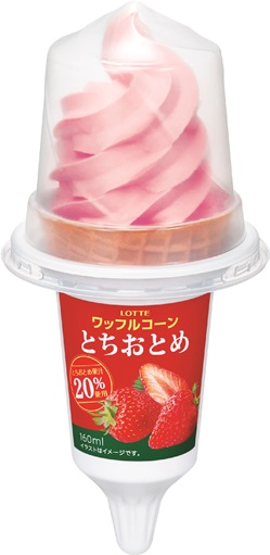 【内容】国産のとちおとめ果汁を使用した優しい甘さのいちごアイスと、小麦粉の一部に全粒粉を使用した香ばしいシュガーコーンを楽しめる、ワッフルコーンアイスです。