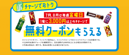 「1 度に3,000 円以上のファミペイチャージ」で対象者全員にファミペイの無料引換クーポンを進呈いたします。