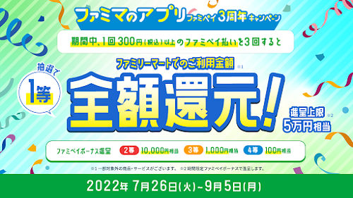 期間中、ファミリーマート店舗で1回300円(税込)以上(※)のファミペイ払いを3回すると1口の応募となり、抽選で当たると、1等は期間中のファミリーマートご利用金額の全額(進呈上限5万円相当)を期間限定ファミペイボーナスで還元いたします。