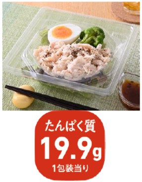 【内容】鶏むね肉、ブロッコリー、玉子をトッピングしたサラダです。別添えのドレッシングは、オリーブオイルを使用した風味豊かな和風ドレッシングです。(1食あたりのたんぱく質19.9g)